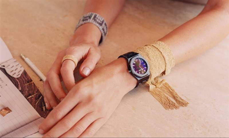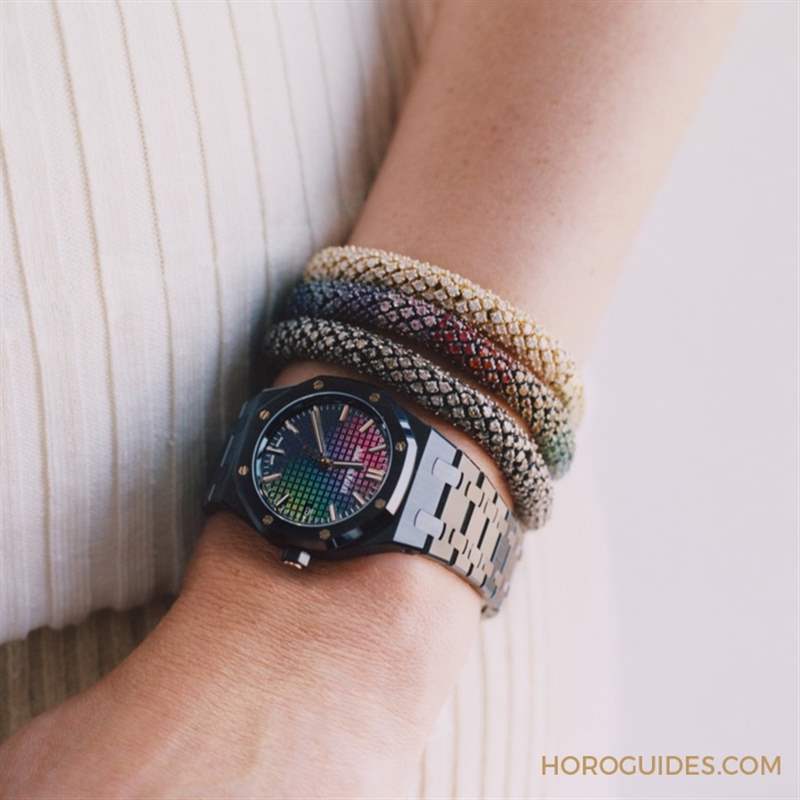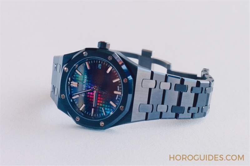 Carolina Bucci這位設計師是何許人也?霜金這種出現在皇家橡樹表系的黃金錘擊工藝,就是在2016那年透過她與愛彼的通力合作,實現應用在愛彼皇家橡樹系列上,「我想讓彩虹出現在最令人意想不到之處,仿如都市街道水漥中的浮油幻彩效果。在原本毫無色彩的黑色畫布上,閃現色譜上的所有色彩。」這位出生義大利珠寶世家的設計師如此描述她在著手設計這只特別版表款時的想像。乍看是黑色表面,但會隨著周遭光線變化而泛映七彩虹光,為創造出這種效果,需在表面的黃銅底板上增添一片以微結構技術刻上小方塊的藍寶石水晶玻璃,締造泛映七彩虹光的效果;接著再以專門開發的工藝在藍寶石水晶玻璃的背面鍍上金膜,達到鏡面效果,照亮表面。呈現出來的虹彩效果因表面而異,因此每一枚表面都獨一無二。