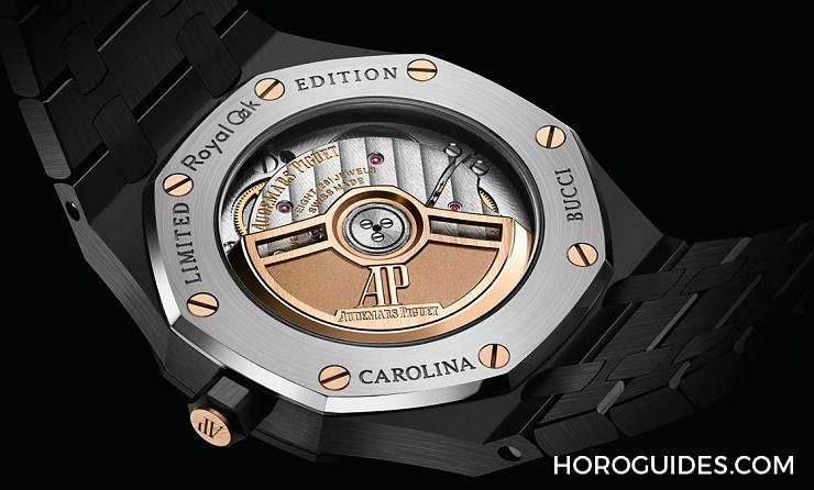 鑲嵌藍寶石水晶玻璃的鈦金屬底蓋刻有「Limited Edition Carolina Bucci」字樣,5800機芯所搭載的22K玫瑰金自動盤表面飾以微珠噴砂、亮面拋光及霧面打磨裝飾,與螺絲、時標及指針的精修裝飾相呼應。