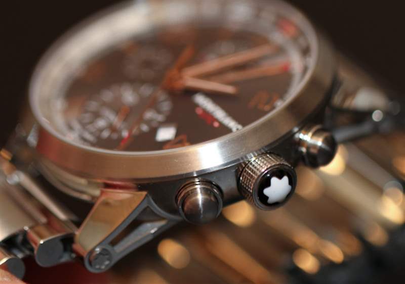 凹陷的計時小表盤極具吸引力,并具有難以察覺的蝸牛紋紋理。子表盤處于不同級別的結果令人賞心悅目。我也喜歡金色的指針和時標,但覺得萬寶龍的設計師在表盤上用了太多的紅色。在我看來,稍微少一點紅色會導致更永恒的外觀。話雖如此,這是一個非常清晰且吸引人的表盤。它也比一些更時尚的 Timewalker 表盤感覺更實用。