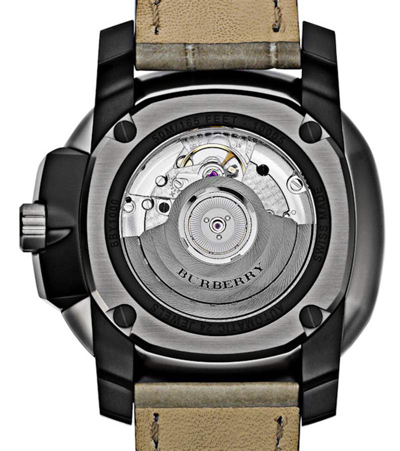 首先,有四種主要的 Burberry 英國時計。商業旗艦型號(但不太可能成為暢銷款)是外觀獨特的英國自動動力儲存手表。它采用 47 毫米寬的大號鋼制表殼,具有 IP 涂層炮銅色飾面。什么,沒有PVD?表殼設計看起來很酷,并有一個可以看到機械機芯的展覽底蓋。事實上,所有的英國機械表都是如此。表帶的選擇看起來不錯,表殼做舊。Burberry 稱之為“風衣色鱷魚皮”。具有諷刺意味的是,盡管它們指的是大衣,但聽起來一點也不奢華。雖然您以前從未見過表盤,但您以前見過像這樣的表盤。這是一個軍用風格的表盤,帶有青銅色和足夠的夜間觀看亮度。