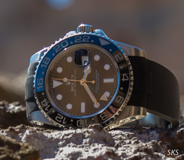 Everest EH-1 Band 黑色表帶顏色與我的 GMT-C 的亮黑色表面和黑色 Ceracrom 表圈相得益彰。佩戴 10 天后,Veraet 的一點橡膠表帶清潔劑使 Everest EH -1 表帶顏色稍深,看起來較新。隨著時間的推移,RubberB 表帶出現了一點古銅色,使用 Veraet 會加劇這種情況,但 Everest EH-1 表帶又恢復了新面貌。很明顯,RubberB 和 Everest Horology 使用了兩種完全不同類型的硅膠。