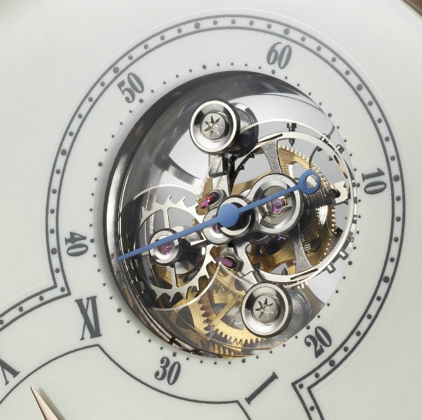 Grande Seconde Tourbillon 提供 18k 白金或玫瑰金款式,表殼寬 43 毫米。白金款配有帶日內瓦條紋的石板色表盤,而玫瑰金款則采用外觀更傳統的大琺瑯表盤。兩者都非常好,但我更喜歡 Cote de Geneva 條紋表盤 – 特別是由于重疊的半透明表盤,我認為它也可能是藍寶石水晶。