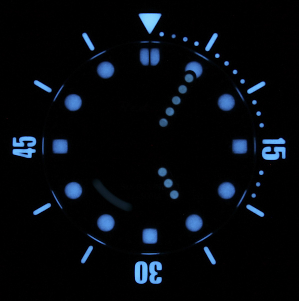 表盤本身非常清晰。剛才第一次看到這塊表時,我對指針的設計不太確定。我認為它們看起來和閱讀起來可能很奇怪。幸運的是我錯了,因為看起來獨特的指針不僅讓我喜歡,而且也很容易閱讀。手上的斑點充滿了內(nèi)腔。正如您所知道的,所使用的發(fā)光體是藍色的——符合許多現(xiàn)代潛水員的趨勢,他們已經(jīng)放棄了傳統(tǒng)的綠色發(fā)光體,轉而使用藍色。