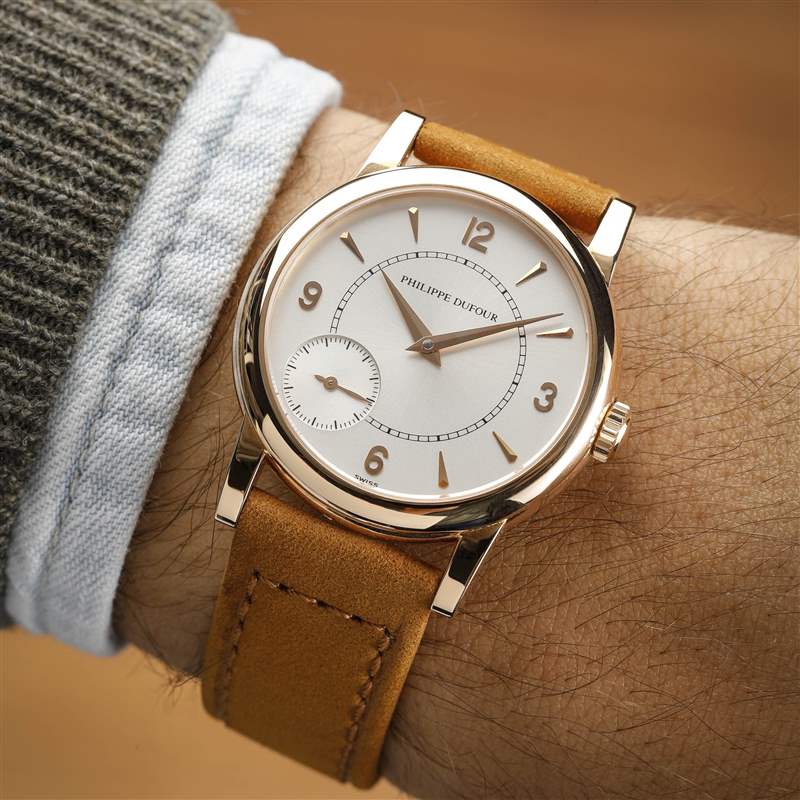 對(duì)于 Duality,Dufour 從他的母校 Valle de Joux 制表學(xué)校于 1930 年代生產(chǎn)的學(xué)校懷表中找到靈感。這些懷表有一個(gè)單一的齒輪系,為兩個(gè)由差速器連接的擺輪提供動(dòng)力。Duality 于 1996 年推出,最初計(jì)劃生產(chǎn) 25 只手表,但最終只生產(chǎn)了九只。對(duì) Dufour 的崇拜與今天不同,獨(dú)立手表的市場(chǎng)也遠(yuǎn)不及今天。如果 Duality 在 2021 年推出,Monsieur Dufour 很容易售出 25 枚。機(jī)芯編號(hào)為“00”的腕表于 2017 年在紐約富藝斯拍賣會(huì)上以近 100 萬美元的價(jià)格售出——在一場(chǎng)由某位紐曼·戴安娜 (Newman Dayona) 領(lǐng)銜的拍賣會(huì)上。這款將于今年 11 月上市的腕表估價(jià)為 872,152 美元至 1,744,520 美元。