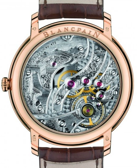 內含寶珀表廠制造的caliver 15B手動上鏈機芯,Blainpain在每個機芯上手工雕刻一些場景。理想情況下,場景是由客戶定制的。對于 Only Watch 2011,他們制作了一個來自摩納哥的場景。對于那些本身不是特別訂制的,寶珀會從瑞士、法國、日本、中國和香港等地挑選和雕刻風景和地標(哎呀,我想知道寶珀表在哪里賣得最多)。請留意稍后的文章,其中包含有關此雕刻過程的一些更有趣的細節(jié)。