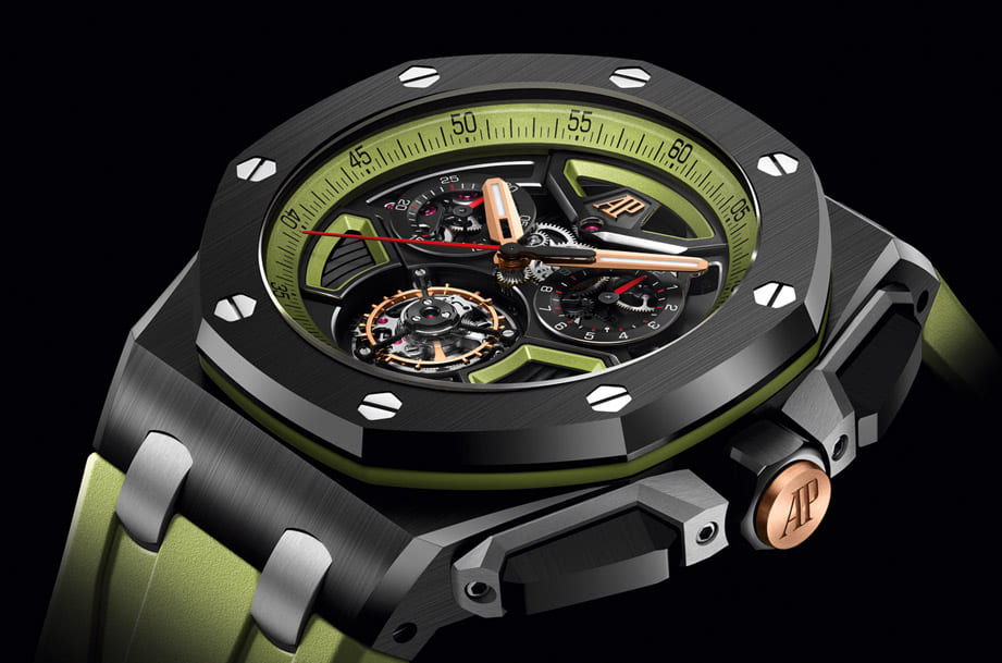▲皇家橡樹離岸型飛行陀飛輪自動計時碼表2023年換上黑色陶瓷表殼搭綠色橡膠表帶,呈現耳目一新的形象。