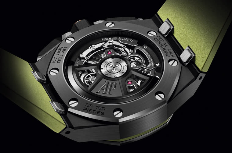 透明底蓋下方的2967自動機芯,以多達536枚零件建構包含飛行陀飛輪與飛返計時等復雜功能,機芯的重點規格如3Hz震頻與65小時動力儲存都是水準以上的設定,其鏤空自動盤也精心鍍上黑色,以與機芯夾板的黑色調呼應,加上手表的背面又都是黑色陶瓷材質,造就整體感強烈的視覺效果。而在表背還會注意到表款採用AP近年新開發的表帶快拆系統,其具有雙重推鎖裝置能讓佩戴者戴表時更感安心,且表款除了出廠時配置的綠色橡膠表帶,品牌也會額外附上一條黑色橡膠表帶,讓表主能夠比較兩種顏色的表帶哪一款更適合自己,或是隨興進行更換。