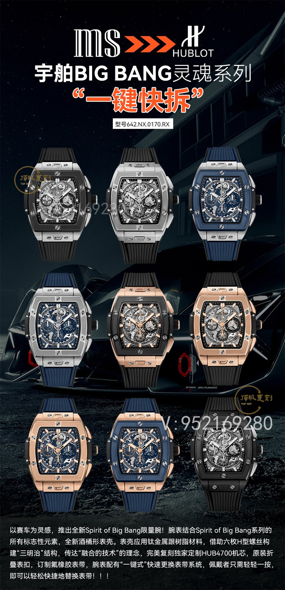宇舶BIG BANG Spirit of Big Bang系列642.NX.0170.RX(多顏色選配)以賽車為靈感,推出全新Spirit of Big Bang限量腕!腕表結(jié)合的所有標(biāo)志性元素,全新酒桶形表殼。表殼應(yīng)用鈦金屬跟樹脂材料,借助六枚H型螺絲構(gòu)建“三明治”結(jié)構(gòu),傳達(dá)“融合的技術(shù)”的理念,完美復(fù)刻獨家定制HUB4700機芯,原裝折疊表扣,訂制氟橡膠表帶,腕表配有“一鍵式”快速更換表帶系統(tǒng),佩戴者只需輕輕一按,即可以輕松快捷地替換表帶。