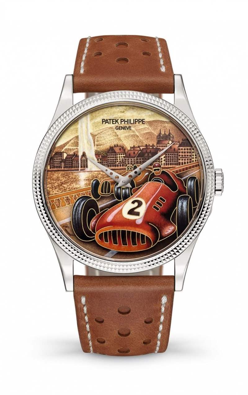手表以Calatrava系列為基礎(chǔ),表圈上的巴黎釘文裝飾和現(xiàn)役的市售基本款6119有強烈的血緣關(guān)系。這款表從表名可知是以1948年國際汽聯(lián)一級方程式賽車為主題,百達翡麗運用掐絲琺瑯、金屬亮片嵌飾琺瑯與微繪琺瑯等多重技法來表現(xiàn)賽車與賽道的沿途風(fēng)光。其中掐絲琺瑯主要用來表現(xiàn)早期的賽車,光是制作出賽車便需使用40公分的金線,繪制琺瑯過程中更要使用多達17種顏色才能捕捉出賽車的色調(diào)與光影效果,至于賽車的車號乃是改以金屬亮片嵌飾琺瑯呈現(xiàn),而在背景部分則以微繪琺瑯勾勒出日內(nèi)瓦大噴泉的湖畔景致。手表面盤的圖案需要重復(fù)上色、燒制多達12次以上,每次都要放進超過820°C高溫的窯中讓琺瑯定色,過程中稍有差池便要從頭來過,制作過程對于顏色、溫度的掌控都必需非常小心。5189G-001手表采用軍官式底蓋設(shè)計,底蓋上鐫刻有“Grand Prix des Nations – 1948”字樣清楚傳達主題,掀開底蓋后則是240超薄機芯,精工細作的水準完全不下于面盤的琺瑯圖案。