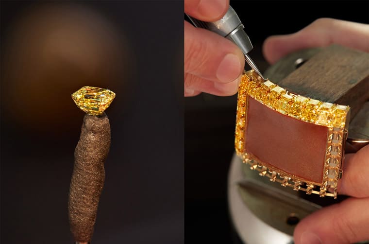 ▲品牌花費好幾年的時間收集制表需要用到的黃色鉆石,最終將其切割出400多顆,約重217克拉,全數(shù)鑲在手表的表殼、鏈帶與面盤上。