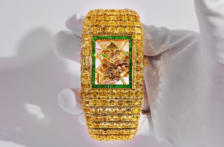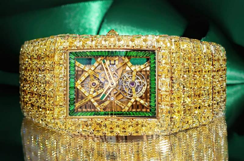 ▲JACOB & CO.最新高級珠寶表Billionaire Timeless Treasure采用大量黃鉆鑲嵌,要價高達2000萬美金。