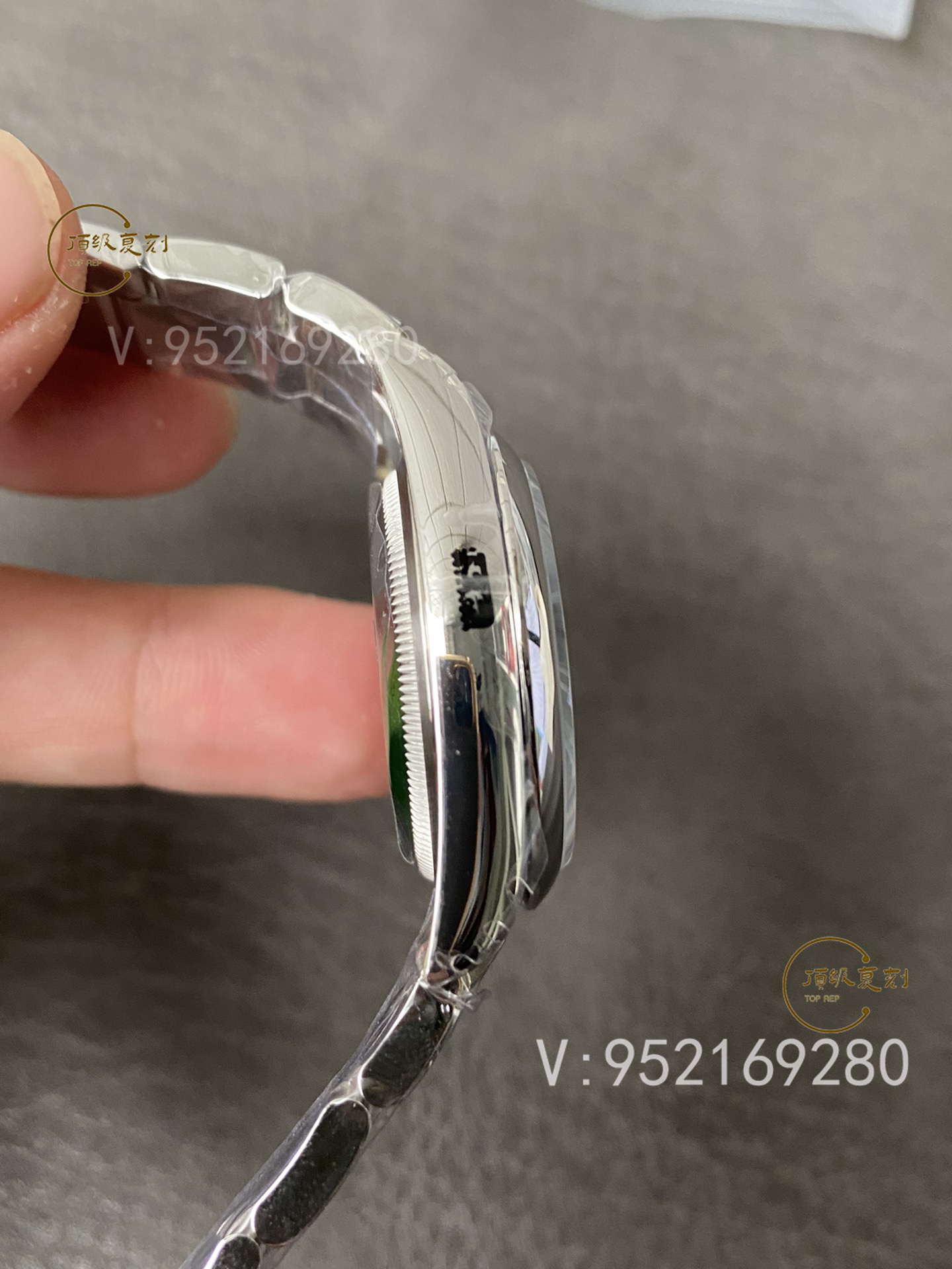 第三是表帶對比。此次VS廠出貨也是拿了幾塊蒂芙尼藍蠔式來看,可以看到這款蠔式恒動鋼帶縫隙比較大,是能夠看到螺栓的,導致表帶比較松散。而EW廠最近的出貨反而這方面做的更好,縫隙更緊致佩戴也舒適。不知道是不是第一批出貨的原因,以后會不會糾正就看后續了。不過表帶的拉絲工藝來說則是VS廠更到位,看不到拉絲的紋路但是更細密,光澤更強。