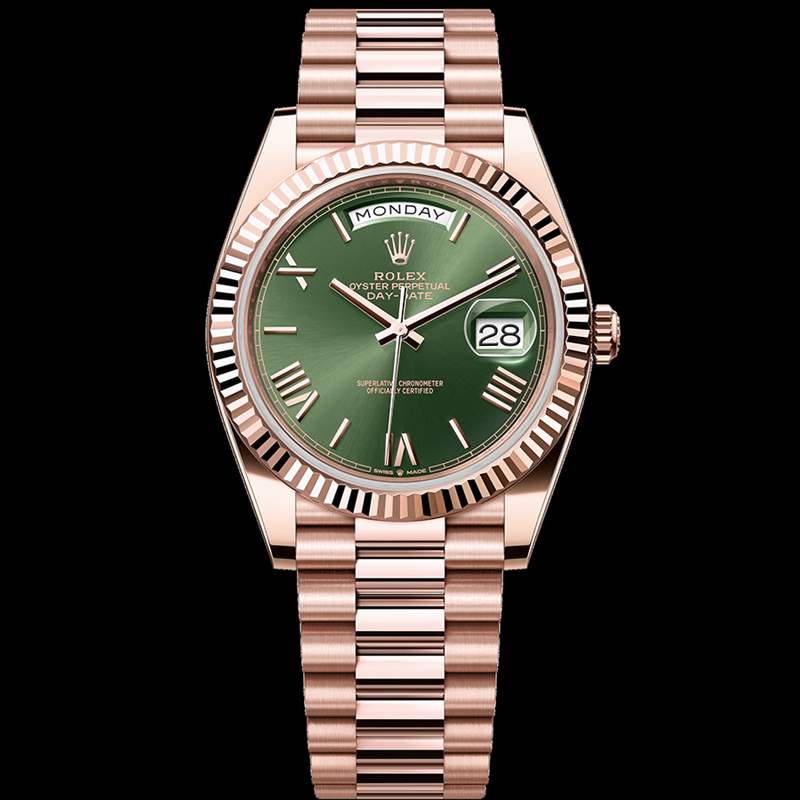 這款特別的 Day-Date 40 毫米腕表擁有令人驚嘆的珍貴材質組合,體現了勞力士對完美的追求——從勞力士專有的玫瑰金合金 18 卡丁永恒玫瑰金到綠色表盤,這款腕表散發著溫暖而奢華的光芒,綠色表盤的顏色在勞力士歷史上一直備受追捧。雖然勞力士多年來為星期日歷型系列提供了多種表盤顏色,但綠色表盤選項尤其受到收藏家和愛好者的歡迎和追捧。