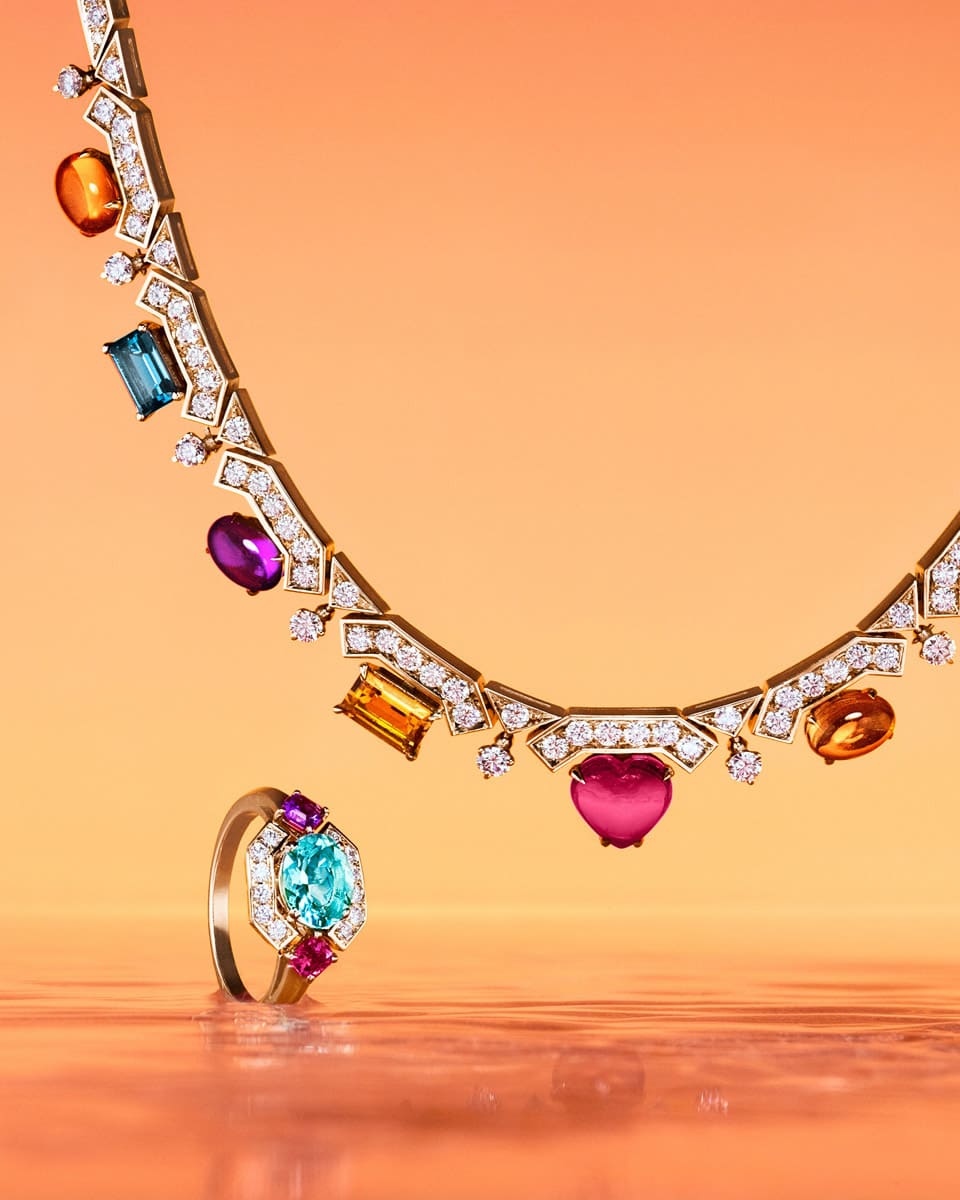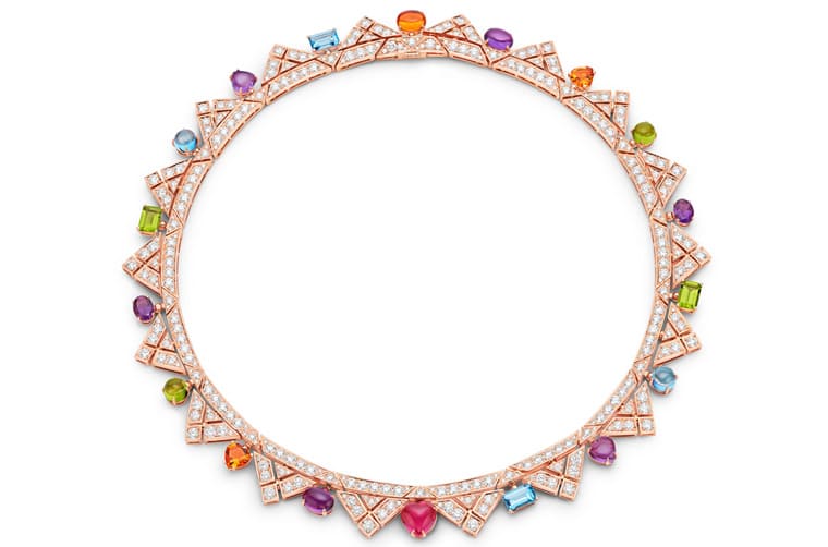 Allegra系列有一款項(xiàng)鏈鑲嵌紫水晶、黃水晶、橄欖石與藍(lán)色拓帕石,在玫瑰金幾何元素環(huán)繞之中,明亮切割鉆石端坐于所有角落,18顆彩色寶石得以歡欣的姿態(tài)與微妙的美感,呈現(xiàn)充滿興味的作品。