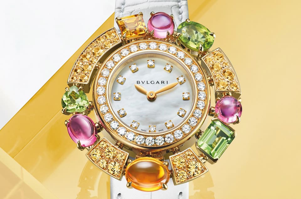 Allegra系列不只有珠寶作品,寶格麗亦將「時(shí)間即珠寶」的理念帶入生活,打造最新的雞尾酒珠寶腕表。腕表將碧璽、黃水晶、玫瑰榴石和橄欖石,以各種充滿歡樂(lè)的造型呈現(xiàn),并搭配粉色或黃色剛玉點(diǎn)綴,持續(xù)以率性歡快的質(zhì)感吸引女性目光,宛如手腕上綻放的嬌艷花朵垂涎欲滴,讓人一見傾心。