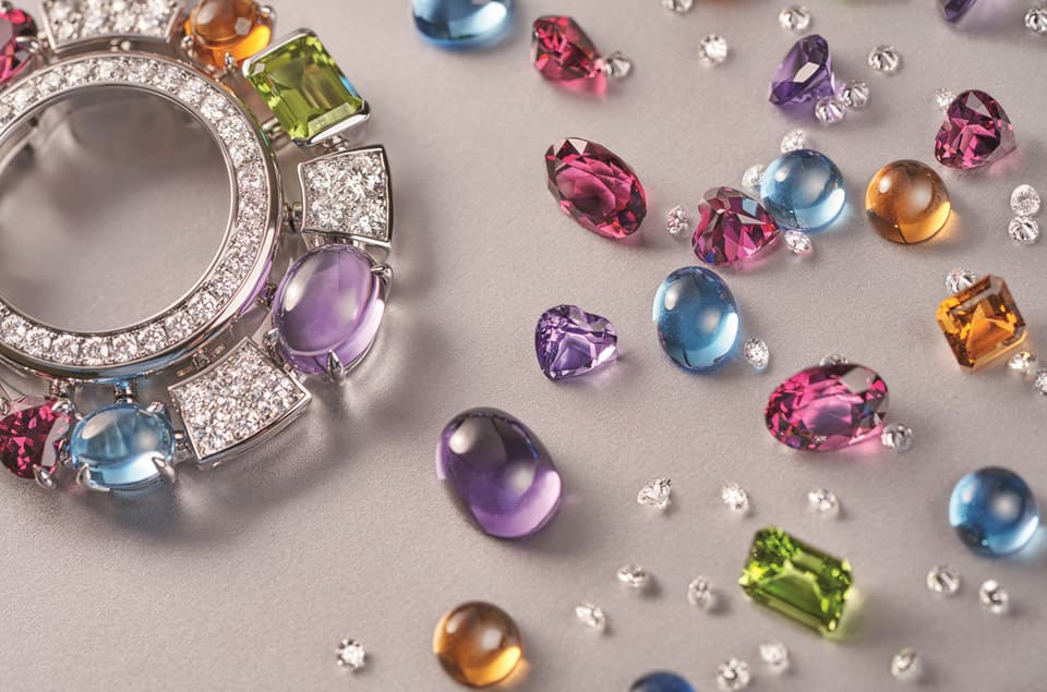 玫瑰金表殼鑲飾82顆圓形明亮切割鉆石、1顆祖母綠切割橄欖石(重約1.29克拉)、2顆蛋面切割藍(lán)色拓帕石(總重約3.06克拉)、1顆橢圓形切割玫瑰榴石(重約1.63 克拉)、2顆蛋面切割與祖母綠形切割黃水晶(1.45 克拉)、2 顆心形、橢圓形切割紫水晶(總重約3.06 克拉)。