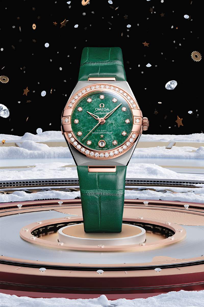 歐米茄顯然也十分投合女性表迷的需求,就以星座系列29毫米至臻天文臺(tái)表不銹鋼 Sedna 18K金表殼搭配皮表帶款為例,表殼兩端經(jīng)典的半月形切面以及「托爪」,表圈鋪鑲鉆石,搭配綠色砂金石表盤(pán),以及同色亮面皮表帶,十分華麗。其表殼為小巧的29毫米,搭載歐米茄8700至臻天文臺(tái)機(jī)芯,透過(guò)拱型耐磨損藍(lán)寶石玻璃表背,機(jī)芯的運(yùn)轉(zhuǎn)美態(tài)清晰可見(jiàn),讓愛(ài)表的女士會(huì)十分欣喜。