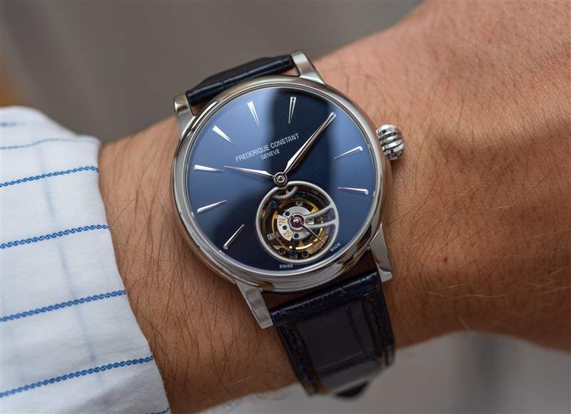 巨大的指針以其體積、復雜的形狀和明顯的縱向彎曲給人留下了深刻的印象。它們也是 FC-980 自產機芯的力量展示,該機芯不僅承載著巨大的時針和分針,還承載著陀飛輪組件。動力儲存只有區區38小時,很短,但至少是自動補充的。FC-980機芯調校為熱、冷、等時、三方位,但沒有說明是否是經過認證的天文臺表。