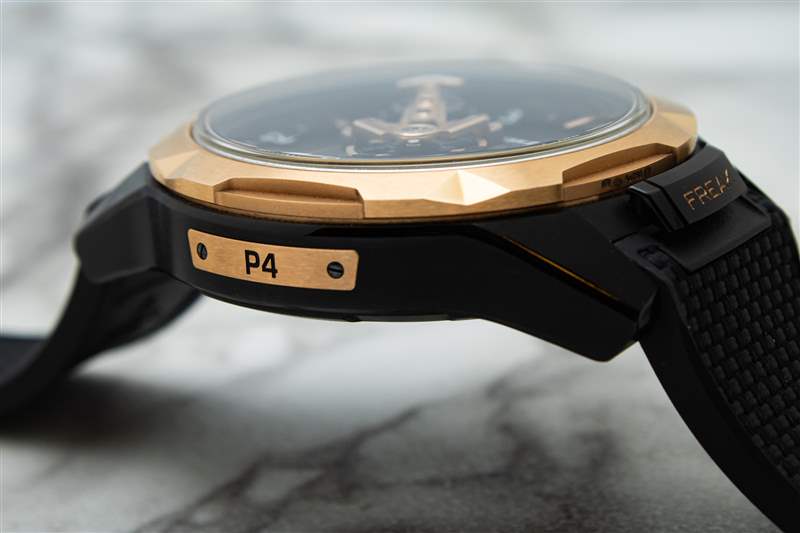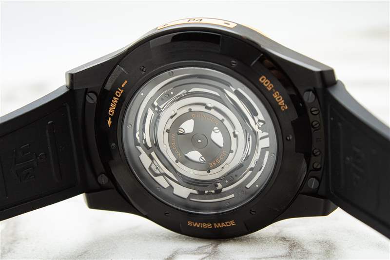 當(dāng)然,實(shí)際上 Freak ONE 并沒(méi)有什么平庸之處,仔細(xì)觀察紅金表圈就可以立即看出這一點(diǎn)。基于這種拉絲和拋光元件中尖銳的刻面圖案,這個(gè)表圈可能看起來(lái)不對(duì)齊,但這是 Freak ONE 獨(dú)特的上鏈和時(shí)間設(shè)置系統(tǒng)的唯一真正的視覺(jué)線索。翻轉(zhuǎn) 6 點(diǎn)鐘位置的“Freak”牌,旋轉(zhuǎn)表圈就會(huì)解鎖,但旋轉(zhuǎn)的不僅僅是表圈本身。扭轉(zhuǎn)這個(gè)雙向表圈還可以向前和向后調(diào)整時(shí)間設(shè)置,為佩戴者提供與 Freak ONE 啟動(dòng)對(duì)話(huà)的齒輪系的大規(guī)模觸覺(jué)連接。在背面,藍(lán)寶石顯示屏底蓋同樣非正統(tǒng)。通過(guò)逆時(shí)針旋轉(zhuǎn)底蓋外環(huán),佩戴者可以手動(dòng)為機(jī)芯上弦,盡管 Freak ONE 的創(chuàng)新上鏈系統(tǒng)使得這一點(diǎn)基本上沒(méi)有必要(稍后會(huì)詳細(xì)介紹)。雖然 Freak ONE 的外殼非常耐磨,而且充滿(mǎn)了有趣的花招,但它的致命弱點(diǎn)就是防水。這是該手表日常佩戴理念面臨的最大障礙,因?yàn)?30 米的深度等級(jí)讓 Freak ONE 根本無(wú)法勝任許多運(yùn)動(dòng)場(chǎng)合的任務(wù)。