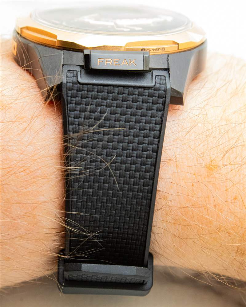 為了完善 Freak ONE 時(shí)尚且(相對(duì)而言)微妙的黑金外觀,雅典表為這款腕表搭配了簡(jiǎn)約黑色的紋理織物效果橡膠表帶。雖然這條表帶柔軟且相當(dāng)舒適,但可以說(shuō)它缺乏其他設(shè)計(jì)的一些特色。然而,作為 Freak ONE 奇特之處的最后一層,這條表帶以相反的方式安裝,唐扣末端位于 6 點(diǎn)鐘位置。表面上這樣做是為了在 6 點(diǎn)鐘表殼一側(cè)的“Freak”銘牌上留出一個(gè)凹口,但它確實(shí)增強(qiáng)了佩戴者的感覺(jué),雅典表憑借這款腕表隨著自己的鼓點(diǎn)起舞。