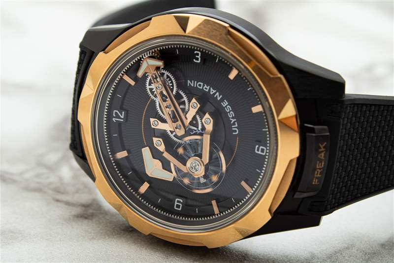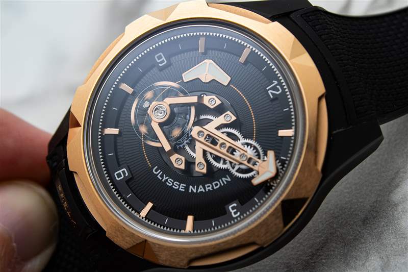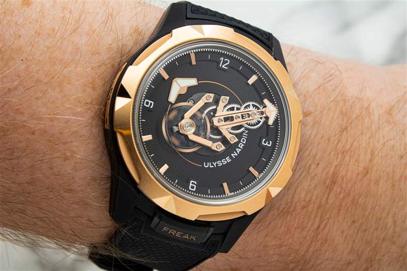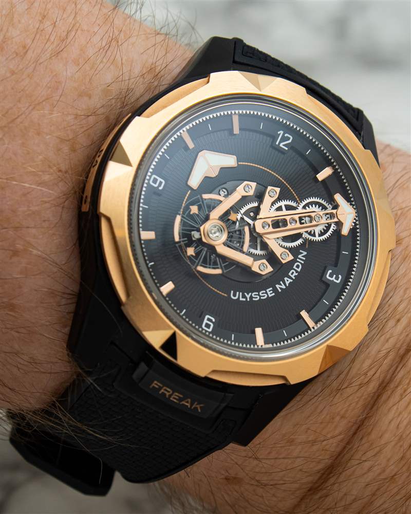 與表殼一樣,雅典表 Freak ONE 的鏤空表盤(pán)以之前的 Freak 型號(hào)為基礎(chǔ),但以更簡(jiǎn)潔、更精致的方式呈現(xiàn)了這些概念。嚴(yán)格來(lái)說(shuō),只有帶有淺色印刷阿拉伯?dāng)?shù)字和鑲貼金質(zhì)時(shí)標(biāo)的狹窄外圈是真正的表盤(pán)表面,藍(lán)寶石水晶下方的所有其他部件都是機(jī)芯部件。大部分空間被一個(gè)寬大的啞光黑色圓盤(pán)占據(jù),圓盤(pán)上有精致的脊?fàn)罴y理,并印有雅典表的文字標(biāo)志。由于此處采用寬大且?guī)в写罅恳构獾慕鹕切涡螤睿撔D(zhuǎn)圓盤(pán)可用作時(shí)針。然而,真正搶盡風(fēng)頭的是分針。這是 Freak 系列的標(biāo)志性碟形盤(pán),這是一個(gè)旋轉(zhuǎn)齒輪系組件,每小時(shí)在表盤(pán)上繞一圈,本質(zhì)上允許機(jī)芯,圍繞自身旋轉(zhuǎn)。與之前的 Freak 迭代相比,該組件在視覺(jué)上顯著簡(jiǎn)化,但 Ulysse Nardin 在形式上添加了對(duì)其自身傳統(tǒng)的厚顏無(wú)恥的認(rèn)可。包含齒輪系組件和分鐘標(biāo)記的主橋結(jié)構(gòu)也形成了該品牌的標(biāo)志性錨徽。錨標(biāo)志出現(xiàn)的唯一其他地方是表帶襯里,這使得這是一個(gè)令人印象深刻的克制品牌活動(dòng)。飛行擺輪橋作為分針的配重,與鏤空表盤(pán)表面上方的齒輪系一起旋轉(zhuǎn),成為動(dòng)態(tài)的視覺(jué)亮點(diǎn)。此外,由于擒縱機(jī)構(gòu)安裝在旋轉(zhuǎn)組件上,F(xiàn)reak ONE 在技術(shù)上還具備 60 分鐘陀飛輪復(fù)雜功能。這是最頑固的運(yùn)動(dòng)書(shū)呆子們的話(huà)題,