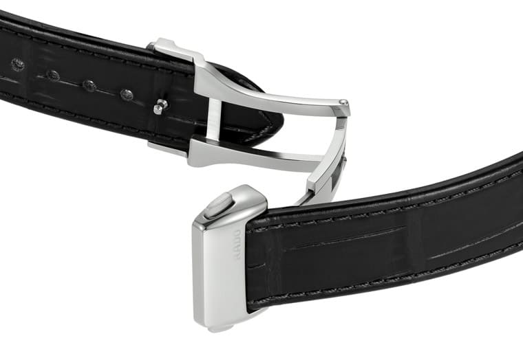 ▲皮表帶搭配鈦金屬折疊表扣,其扣面與表殼同為金屬陶瓷材質。