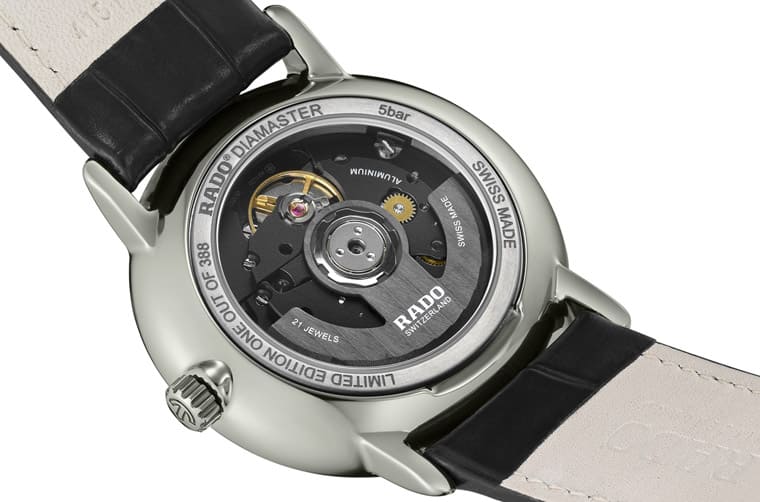 DiaMaster Thinline鉆霸系列金屬陶瓷超薄自動限量表搭載的R766機芯在透明底蓋下可以看得清楚,機芯背面的零件多數都鍍成黑色,而自動盤也刻意做成船錨造型,并加上日內瓦波紋修飾,在小地方展現進階的制表工藝讓人有驚喜感,這枚機芯的動力儲存達72小時,日常佩戴綽綽有余。