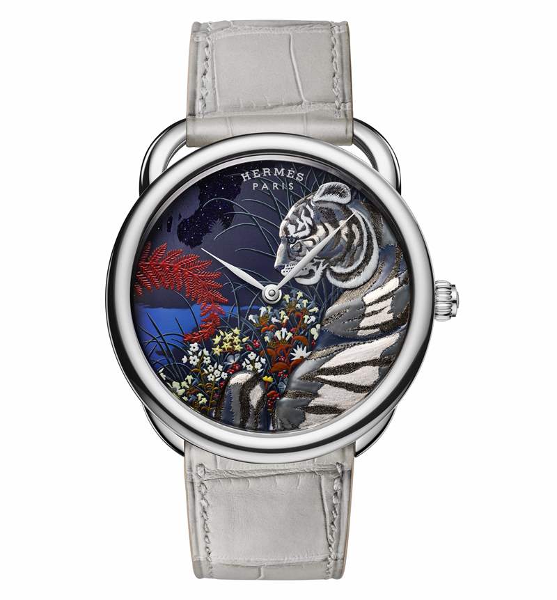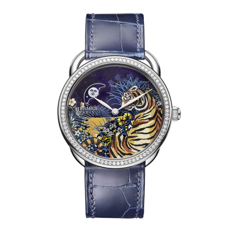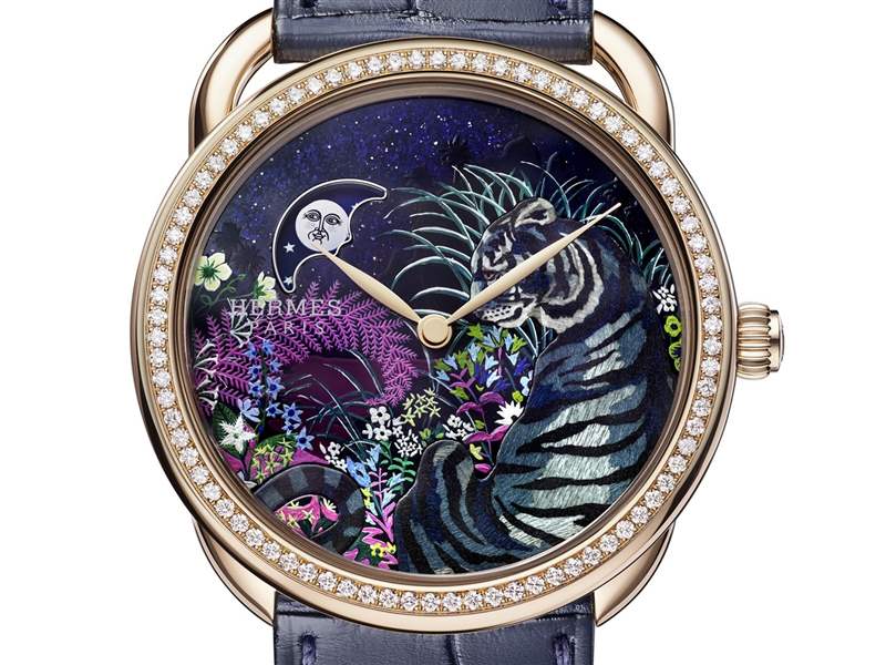 「Arceau Tyger Tyger」虎虎生威腕表描繪一只猛虎藏身于灌木叢中的自然場景——月相盤巧妙「懸掛」于深藍色砂金石表盤,這只老虎采用細木鑲嵌工藝制作,通過235枚不同顏色的手工上色木片鑲嵌拼出虎紋,木材的天然紋理讓虎毛的質感栩栩如生,手工上色細節創造出微妙的明暗與光影效果。