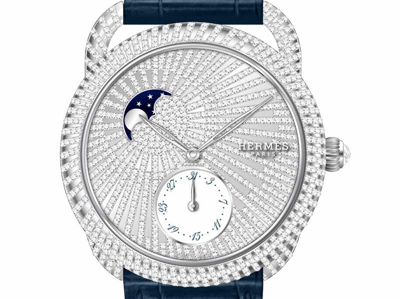 珠寶腕表中最引人注意的是一枚「Arceau Petite Lune」小月相腕表——以10點的月相盤為中心,通過1084顆明亮式切割鉆石在表盤、表殼及表耳上勾勒出放射狀線條,在白金盤面的襯托下熠熠生輝,如同皎潔的月光鋪灑大地,風格浪漫而充滿詩意。