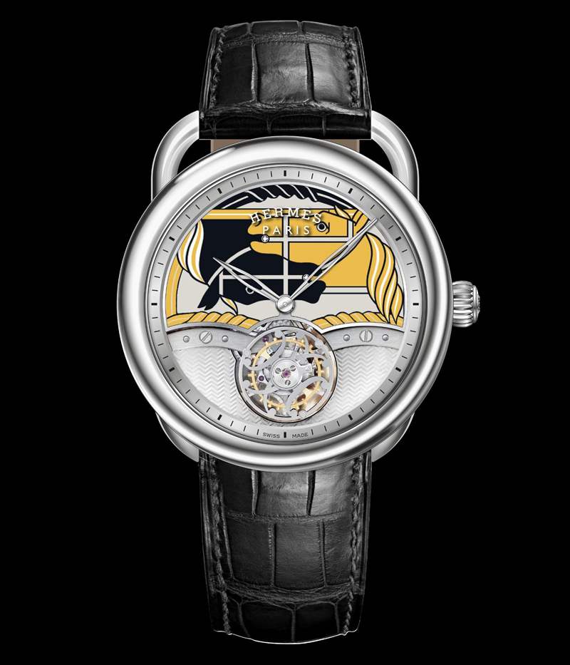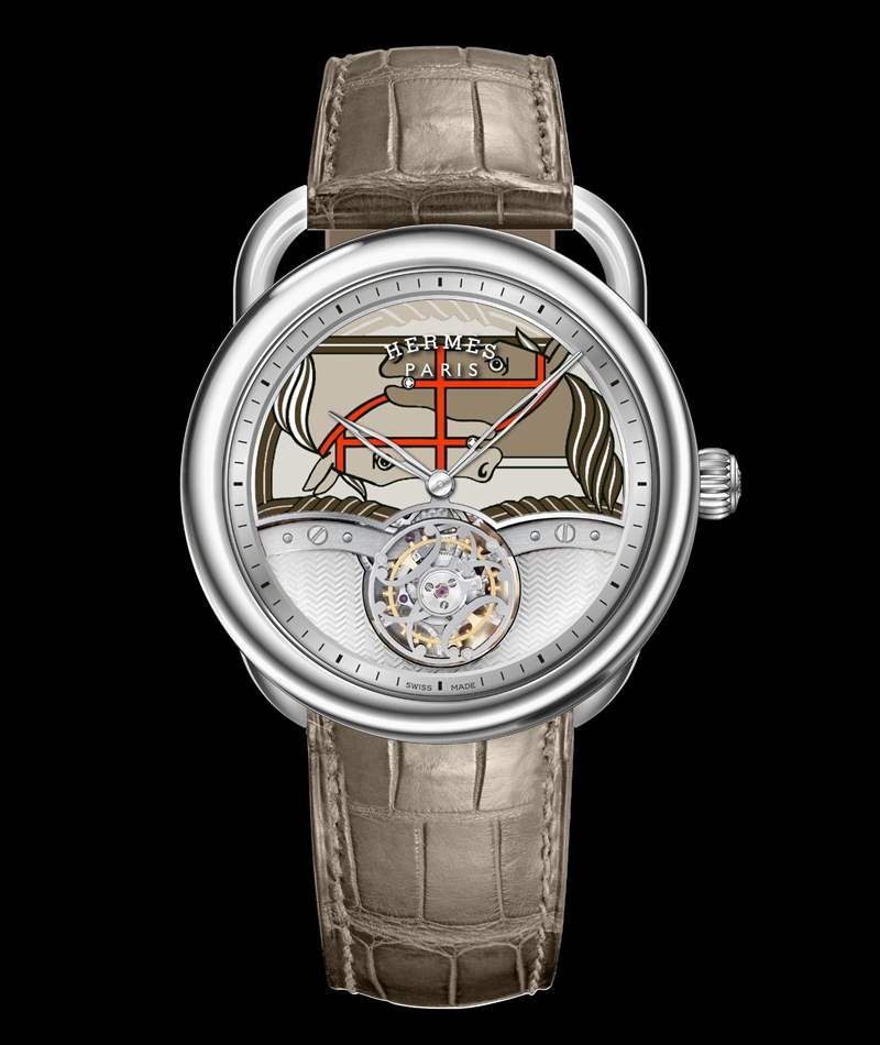 Arceau 系列本次推出一款復雜功能作品——「Arceau Quadrige」飛行陀飛輪腕表,表盤以掐絲琺瑯工藝塑造出抽象風格的駿馬圖騰,每一枚表盤的琺瑯圖案均需經過多次燒制。飛行陀飛輪框架的「雙H」元素源自巴黎圣奧諾雷市郊路 Hermès 精品店的鐵藝裝飾,陀飛輪兩側裝飾幾何璣鏤紋理。