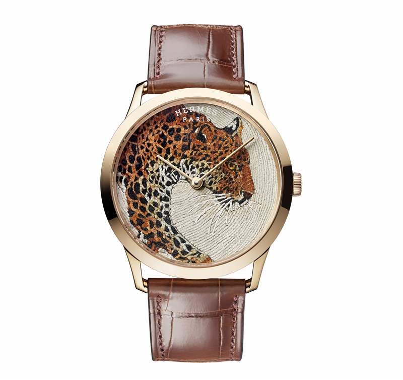 「Slim d’Hermès Panthère」腕表的設計靈感來自 Hermès 同名絲巾,采用皮革馬賽克鑲嵌工藝(Leather Marquetry)創造一只靈動的「印度花豹」。這只花豹由數千枚微小的皮革碎片組成,所有碎片都由工匠手工剪裁和拼貼,再現花豹皮毛的柔軟觸感,不規則的黑色斑點尤為突出。每一枚表盤制作耗時超過一周。