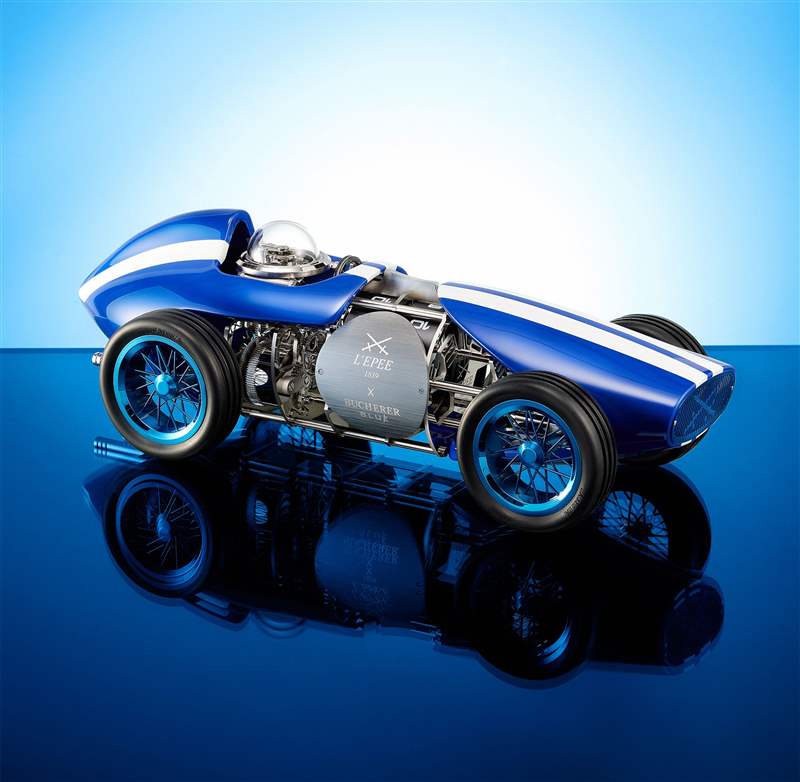 這只座鐘的外形如同一輛帥氣的小賽車,流線型的外殼由鋁合金制成,重量約4.7千克。車身和輪轂采用醒目的亮藍色涂裝,車身右側銘牌上刻有 L’Epée 和 Bucherer BLUE 的標志,左側以數字轉盤方式顯示小時與分鐘,轉動賽車方向盤可以調校時間。