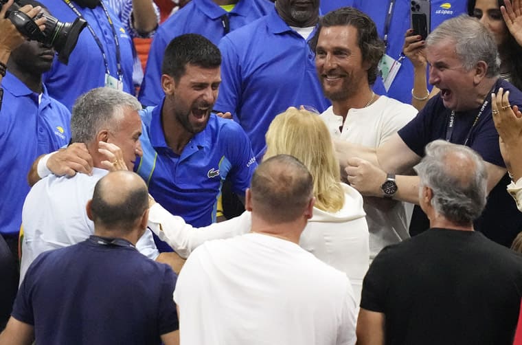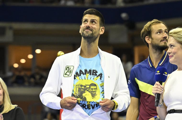 ▲塞爾維亞球王喬科維奇奪下2023年美網(wǎng)冠軍,賽后他穿上印有自己與已故籃球巨星Kobe Bryant合照的T-Shirt,向自己的第24座大滿貫以及Kobe的24號(hào)背號(hào)致敬。