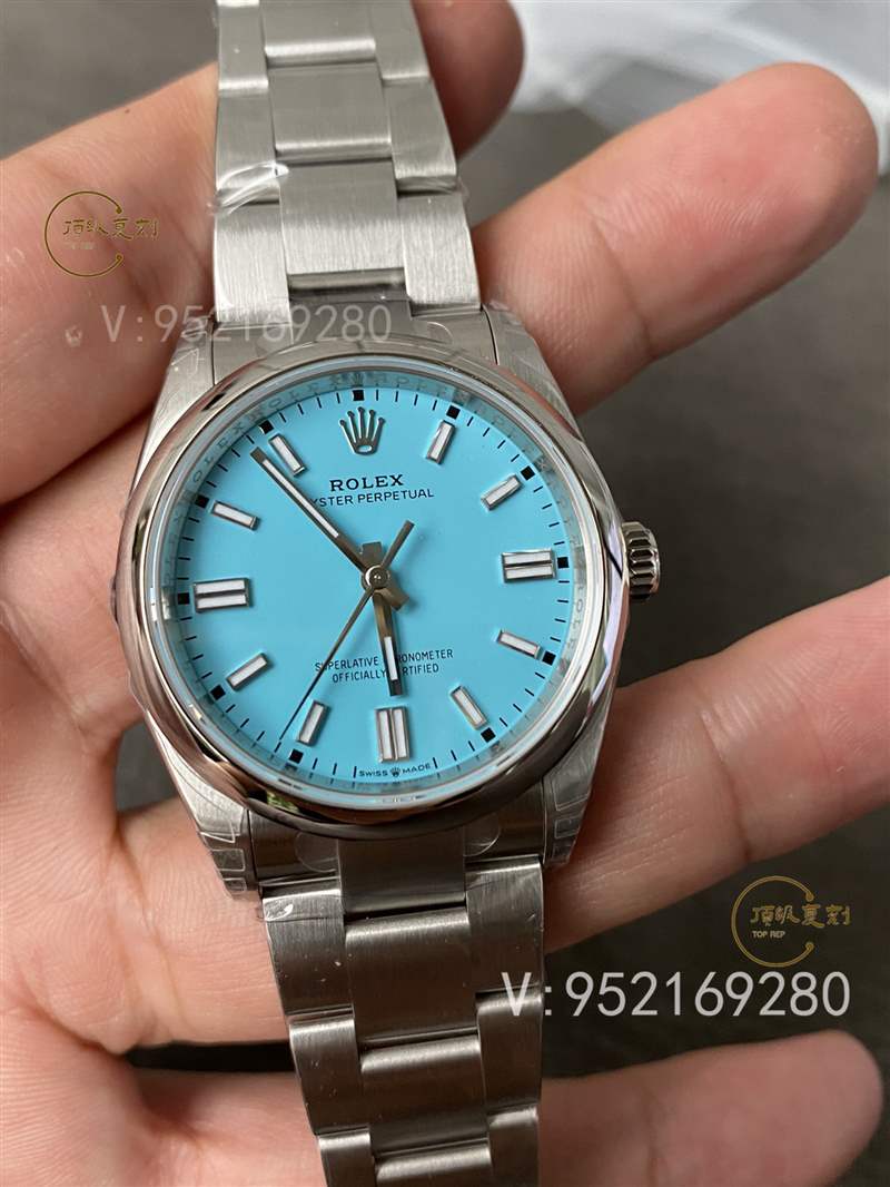 這一次我們對比的這一只Tiffany藍恒動,也是比較多人關注的款式,外觀呈現的淺藍色也屬于比較熱門.關于尺寸方面就有31mm-36mm-還有41mm,目前兩家廠都是除了36跟41mm.尺寸方面就沒有特別多的對比,都是同樣的工藝同樣的材料,只是把復刻的模具增大尺寸就能夠完成的小問題.除了機芯之外的對比,對于表盤之間的比對也是比較重要的.因為關于這張藍盤的復刻難度比較要做到對版的狀態是需要原裝開模才能夠一比一還原.C廠恒動正是使用了正品開模,經過測試幾次的色板對比,達到接近百分之98后才會進行量產.