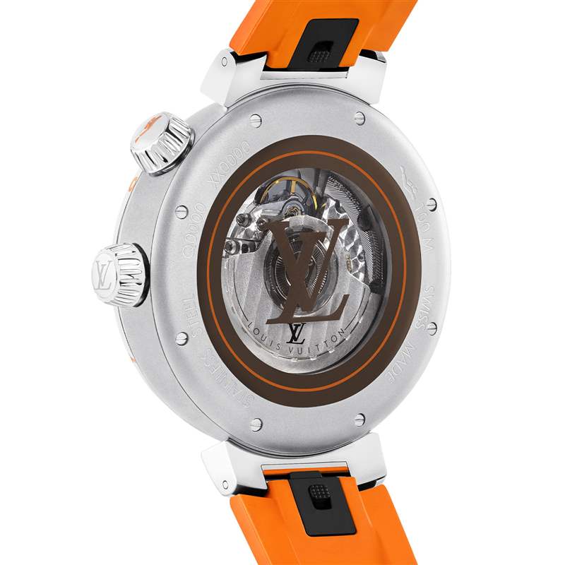 搭載 ETA 2895-2 自動(dòng)上鏈機(jī)芯,擺頻28800vph,動(dòng)力儲備42小時(shí),擺陀及藍(lán)寶石水晶底蓋均飾有 LV 標(biāo)志。