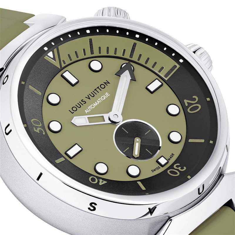 44mm 鼓形表殼由精鋼打造,提供100米防水能力,表圈經(jīng)過鏡面拋光并銘刻「Louis Vuitton」字母,中層表殼和表底則采用磨砂工藝。2點(diǎn)的額外表冠頂端裝飾「潛水員」圖標(biāo),表明其用于旋轉(zhuǎn)帶有潛水刻度的內(nèi)表圈。