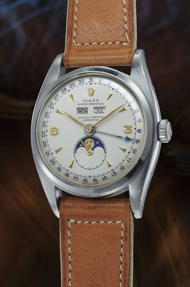 再來勞力士的部分以不銹鋼材質的6062馬首是瞻,它的受矚目程度還要高過黃金Daytona 6265以及早期的水鬼Submariner 6200,但令人有點意外的是,6062并非是品牌主流的運動表,而是一款全日歷月相正裝表,表款的預估價之所以如此驚人就在于此型號屬于勞力士最珍稀罕有的超級爆款,而且包括表殼材質以該型號而言相對少見、表況也保持良好等條件,都有助于推高手表對于收藏家的吸引力。這只勞力士的估價與Nautilus 3700P同為1,000,000~2,000,000瑞郎。
