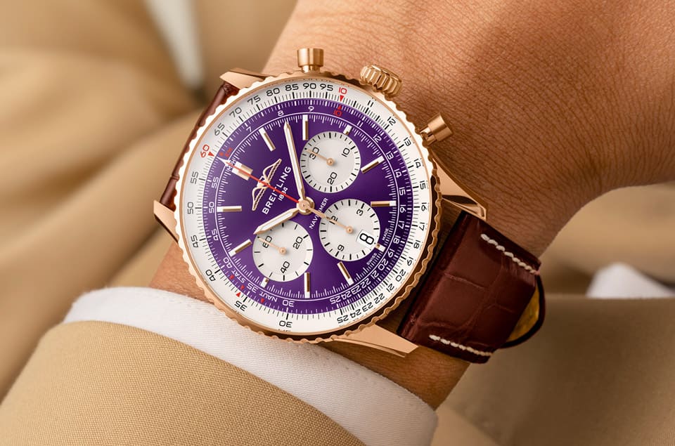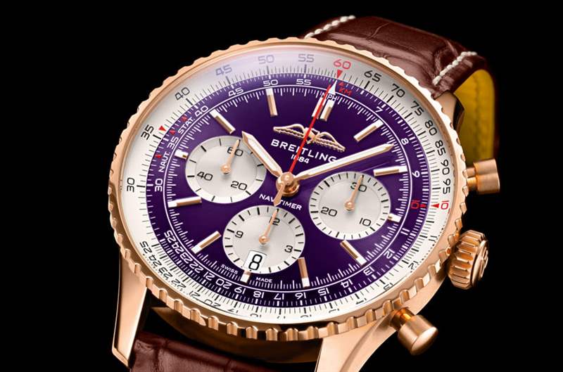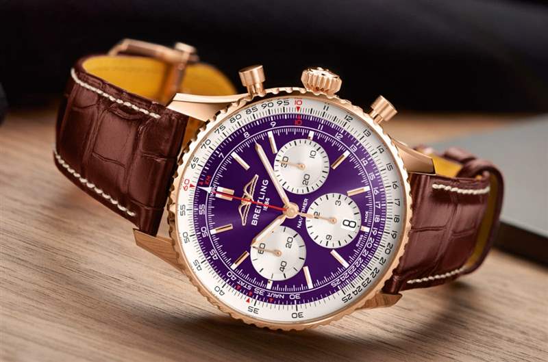 ▲表款采用玫瑰金材質搭配紫色面盤,結合Navitimer經典的環形飛行滑尺、計時功能等設定,賦予手表同中求異的收藏魅力。