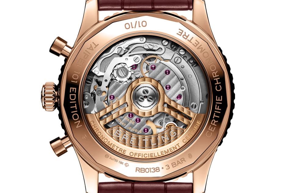 除了面盤的罕見配色,表背透明底蓋也還有其他驚喜,佩戴者在一睹精密的B01自動機芯之余,包括鏤空自動盤、日內瓦波紋、緞面修飾等都具有一定水準,甚至也能窺見傳統計時碼表不可或缺的導柱輪機制,以及擒縱系統即時的運作動態,從自動盤邊緣鐫刻的文字可知機芯通過瑞士天文臺認證,確保其走時品質值得信賴。前面提到的驚喜就展現在透明底蓋邊緣的K金部分,百年靈鐫刻了”TAIPEI 101 EDITION”字樣以及手表的限量編號(限量10只),凡此都增添了手表珍貴的收藏意義,因此一推出詢問度也非常高,成為最近百年靈的話題明星。