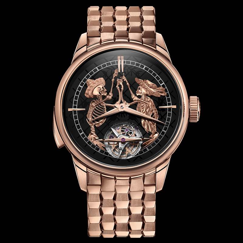 表款的縞瑪瑙面盤以噴砂技法裝飾墨西哥常見的papel picado紙雕圖樣做為背景;一對手工金雕的骷髏情侶露出微笑、在面盤上牽手共舞,金雕刻畫之細(xì)膩,就連墨西哥大草帽上的草編纖維都細(xì)膩可見。這對骷髏愛侶象征著永恒的愛情、不朽的記憶,同時(shí)呼應(yīng)著墨西哥亡靈節(jié)的主旨,永遠(yuǎn)是關(guān)于記憶的美好,而非遺忘或是失去。