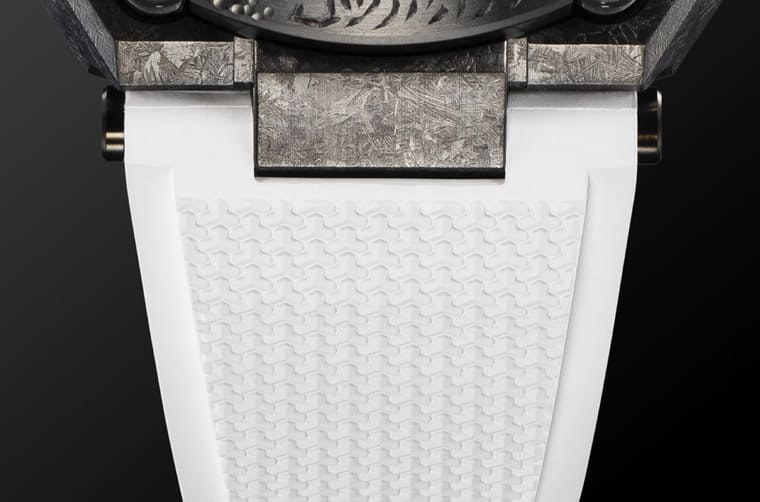從頭盔截取的繆思還包括手表的表帶,《沖擊丸:皚》的「皚」是純白色之意,這點(diǎn)和武士大膽的決心和忠于自我的意志隱隱呼應(yīng),因此G-SHOCK就順著「皚」這個(gè)字選用白色Dura Soft氟橡膠表帶,表帶表面上刻印有細(xì)致的立體紋路,看起來又和《沖擊丸:皚》后頸的裝飾有點(diǎn)似曾相識之感,由此強(qiáng)化手表創(chuàng)作淵源。