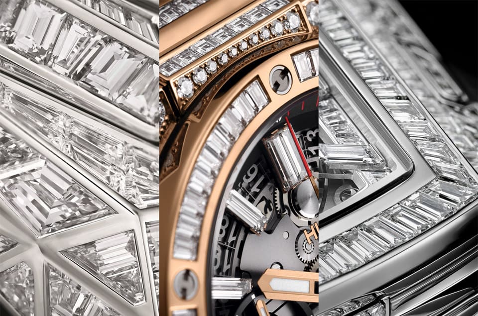 宇舶近年除了研發陶瓷與藍寶石材質有成,品牌也積極創作高階運動表引領表壇潮流,其中結合珠寶鑲嵌工藝的作品便是這類手表不可或缺的重要成員。宇舶在創作各式各樣的鉆表時,從篩選材料到后續的鑲嵌階段都非常講究,例如品牌專挑成色F及G、凈度介于IF~VVS2、車工為EX~VG的鉆石,制作過程中宇舶通常會將鉆石以矩形、方形以及梯形切割呈現,大致而言,品牌旗下每一款高級訂制鉆表光是選材和鑲嵌的工時加起來都在200小時以上,精工細作的水準完全體現在手表外觀的奢華璀璨樣貌上,令人看得如癡如醉。