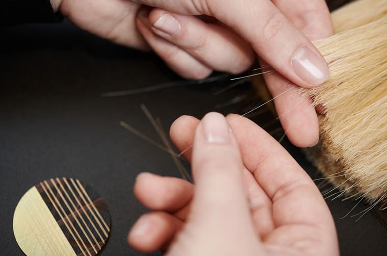 懷表在制作過程中,要先選擇不同色調的馬鬃,并且剪裁出不同長度,接著品牌工藝師要按照原先計劃好的Masan-Masan絲巾圖案,在面盤上將馬鬃一一黏合組成圖案。不同色調的馬鬃利于工藝師呈現主題物件的立體感與對比性。而在另一匹駿馬的部分,工藝師純憑雕刻工具,在黃金上一刀一刀刻出駿馬的輪廓,以帶有編織紋路感的線條,將愛馬仕的設計雛形具體化為現實。
