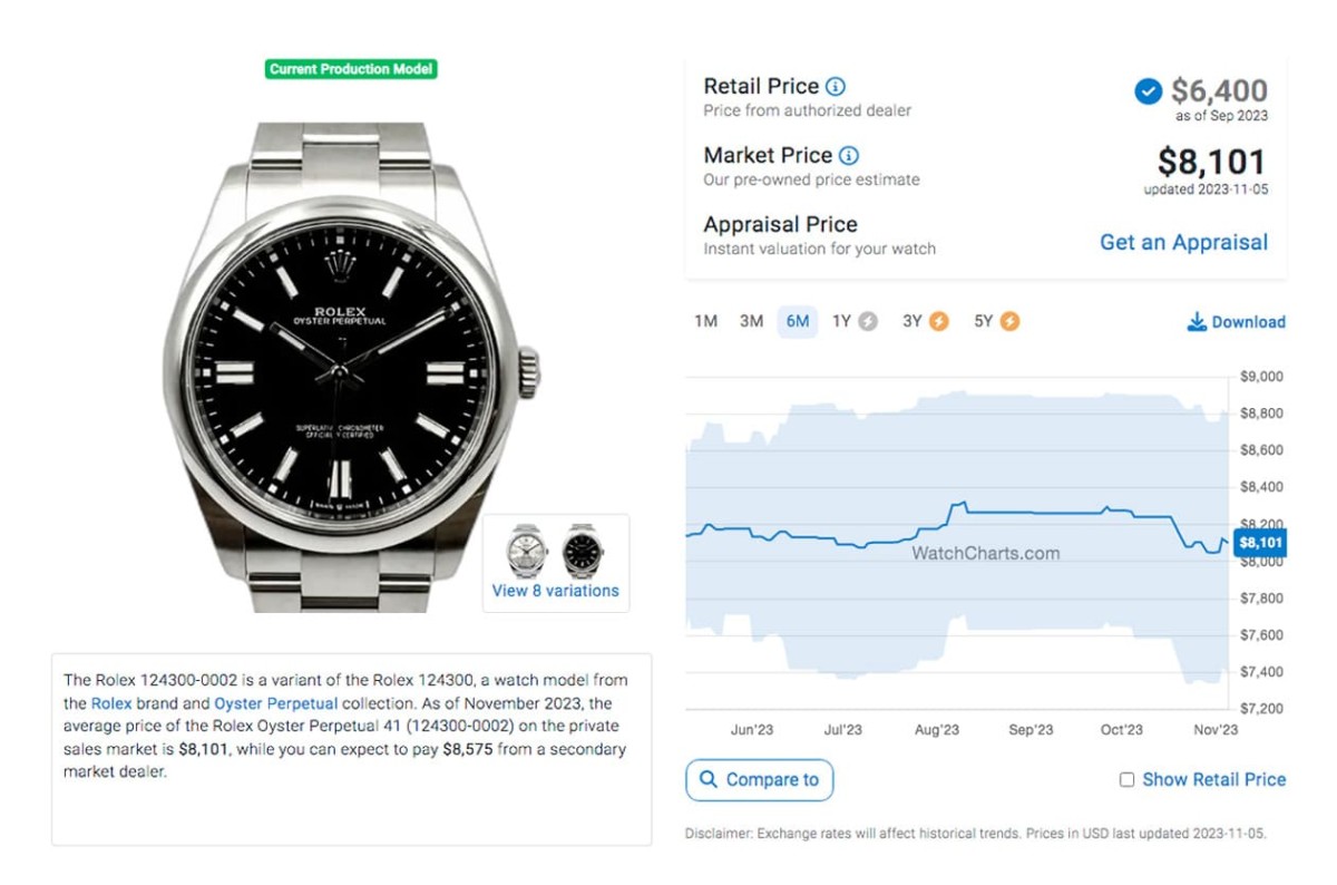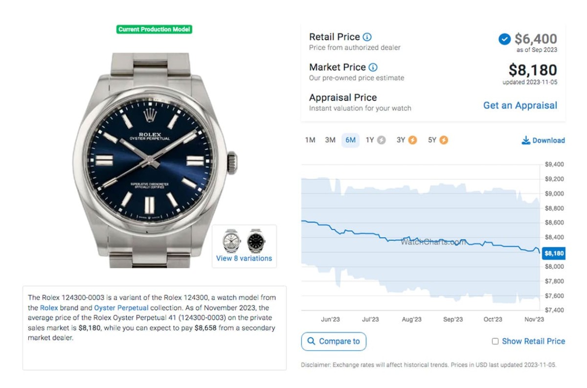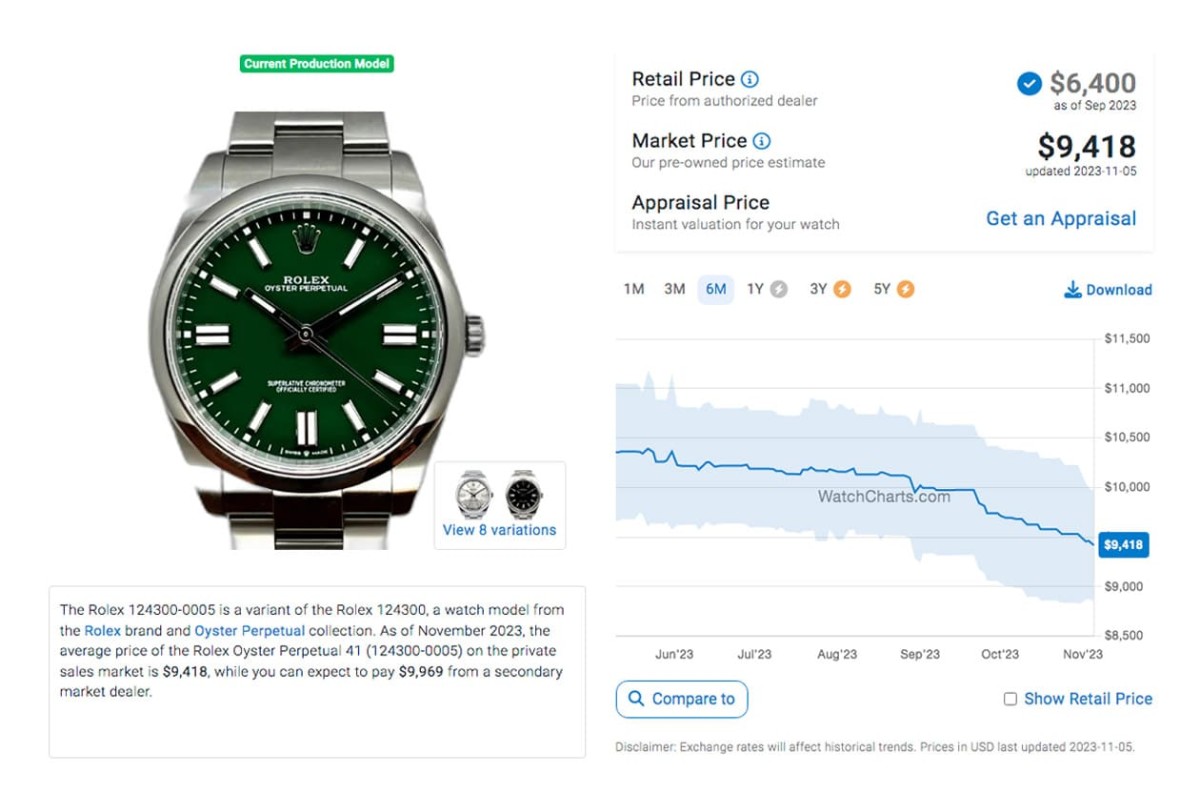 目前41mm的OP手表除了彩色氣泡面以外,其他幾種面盤的行情經過一年半多的撞墻期后都已經有所下調,光是從2023年第1季中后段迄今這半年多的時間來,手表的二級市場價格又有了些變化。其中價格最穩的其實是相對樸素的銀面,根據高級手表市場調查研究機構WatchCharts的資料,這款表的身價雖然是現役五款OP中最低的(8,085美金,約合臺幣25萬9),但它過去半年來的價格曲線還滿平穩的;反而是前兩年聲量高的綠色漆面如今行情已降至9,418美金(約合臺幣30萬2),對照半年前還在1萬美金出頭的行情,等于半年來就縮水了3萬多臺幣。倒是2023年才剛上市,搶手程度還在高點的OP彩色氣泡面,過去一個月行情有再漲高一波,目前成長到17,572美金(約合臺幣56萬4),短短一個月前后身價變化頗大,接近這款手表剛出現在二級市場一度喊到超過1萬7美金的高峰,算是擺脫了之前一段時間的低潮。