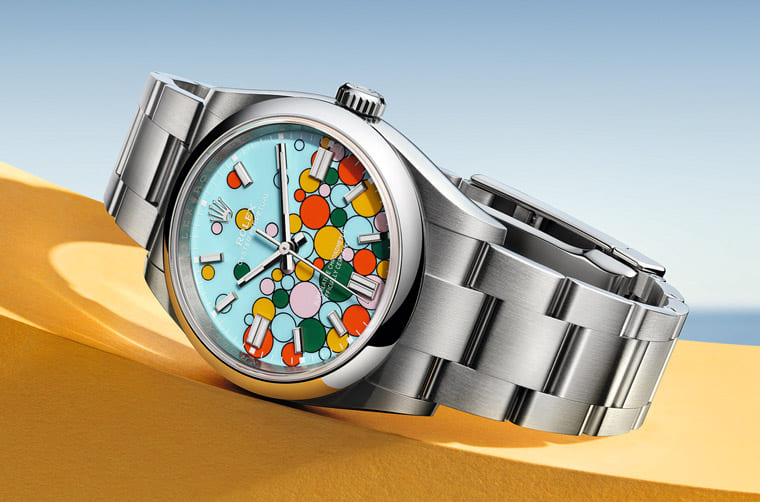 ▲Oyster Perpetual系列2023年將前兩年彩色漆面的五種顏色匯聚在單一表款上,形成繽紛亮眼的「慶典」(Celebration)面盤圖案。Source: