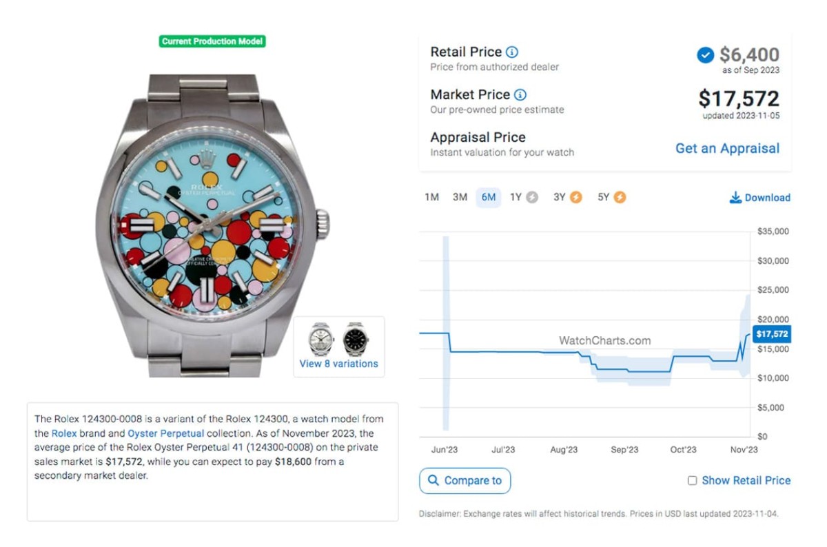 不過OP彩色漆面并非五種尺寸五色都有,僅31、36和41mm有彩色漆面的待遇,而且其中也只有36mm五色齊全,其他兩種尺寸都分別少了一個顏色,加上2022年后勞力士又大舉減少彩色漆面的款式,例如41mm就被砍到只剩下綠色一種顏色,市場的選擇頓時少了許多。2023年品牌再端出「慶典」(Celebration)面盤圖案,也就是表迷口中的「彩色氣泡面」,又再把人們的注意力拉回這個系列上。目前Oyster Perpetual系列男性優先追求的41mm款式定價如下: