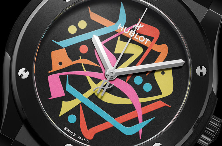 ▲宇舶在迪拜鐘表周期間推出經(jīng)典融合魔力黑陶瓷迪拜特別款,特色在于面盤上的設(shè)計(jì)書法文字。