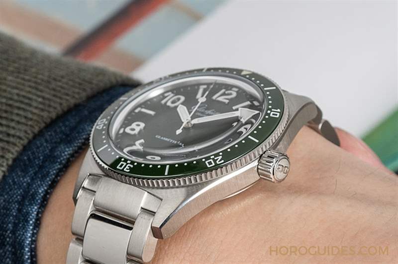 格拉蘇蒂原創的SeaQ系列是以1969年問世的首款潛水表Spezimatic Type RP TS 200為原型,有43.2毫米以及39.5毫米兩種尺寸,對比當時原型的36毫米表徑,這款的表徑39.5毫米更接近原始表款、更具Vintage風格,而這樣的尺寸在潛水表里也是屬于相對袖珍一些的大小,但你并不會因此覺得這款表過于精巧纖細、仿佛一碰就會損傷;相反的,你能夠感受到穩健、堅實的風格,而這正是格拉蘇蒂原創為我們打造的德系運動表。