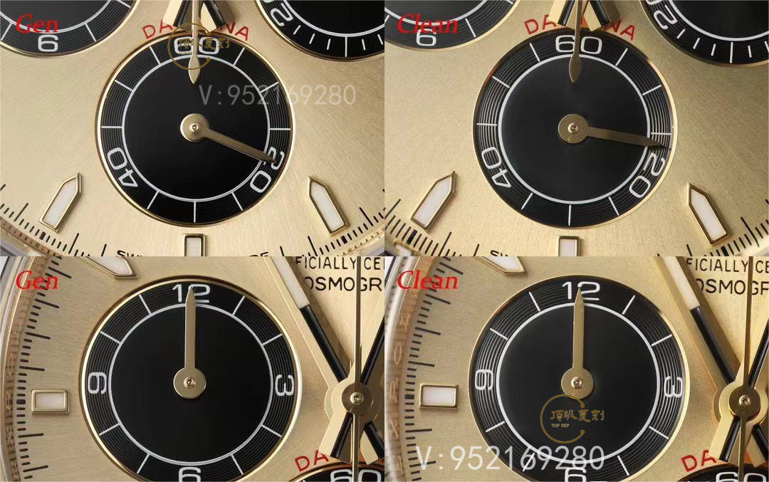 這個4131余文樂已經出了有一段時間了,真假對比最近才整理出來。表盤顏色,太陽紋,字體印刷,都是可圈可點。116518的余文樂已經是無敵的存在,其實126518也是延承一樣的工藝。字釘粗細問題,因為當時同時購買了6只新款4131原裝,水泥灰 余文樂 黑白熊貓 間金*2,我們仔細研究后發現,真品字釘粗細有差別,指針也有差別。對于以上說法存疑的表友可以去翻看之前的126519水泥灰/126500黑白對比圖。c廠每年經手過的真品勞力士也是數不勝數,對于勞力士所有款式的所有細節也是順手拈來。也請相信我們的專業能力。c廠一路走來,磕磕絆絆,感謝所有的表友的支持。我們也將以最好的產品質量來回饋表友的信任。c廠相對其他工廠價格略高,那是因為,在購買真品這件事上有一種執念,無真品,不起模的原則。勞力士原廠套娃,換換盤色就是新款,c廠為了跟足原裝,同系列產品 ,不同顏色都要每個都買回來對色。c廠對于配件品質要求都是極其的高,甚至仿c的工廠找到c的某些配件代工廠,去單獨購買c廠篩選下來的瑕疵品。實在是不理解這樣的操作。