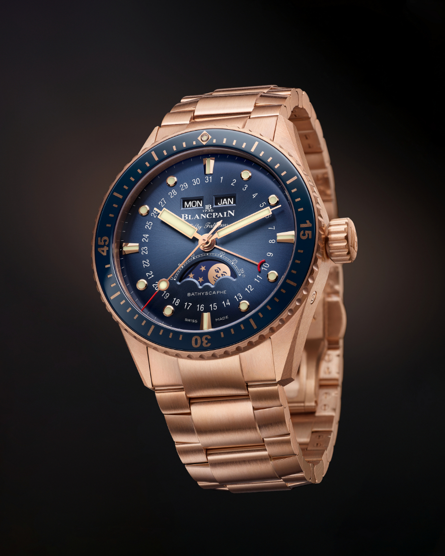 Fifty Fathoms自1953年首次亮相,專為專業潛水而生,而Bathyscaphe則是以適合日常佩戴的目的而設計,并于1956年推出,直徑減小、造型更精簡,同時也具備不低的防水性能。 繼早前為Fifty Fathoms Bathyscaphe首配黑色陶瓷煉帶之后,BLANCPAIN近日再為Bathyscaphe全歷月相款及飛返計時碼表款首推紅金鏈帶版,從表殼、表冠和按鈕以至表鏈,都散發出紅金高貴而搶眼的光澤。